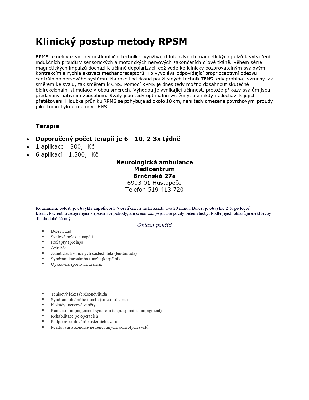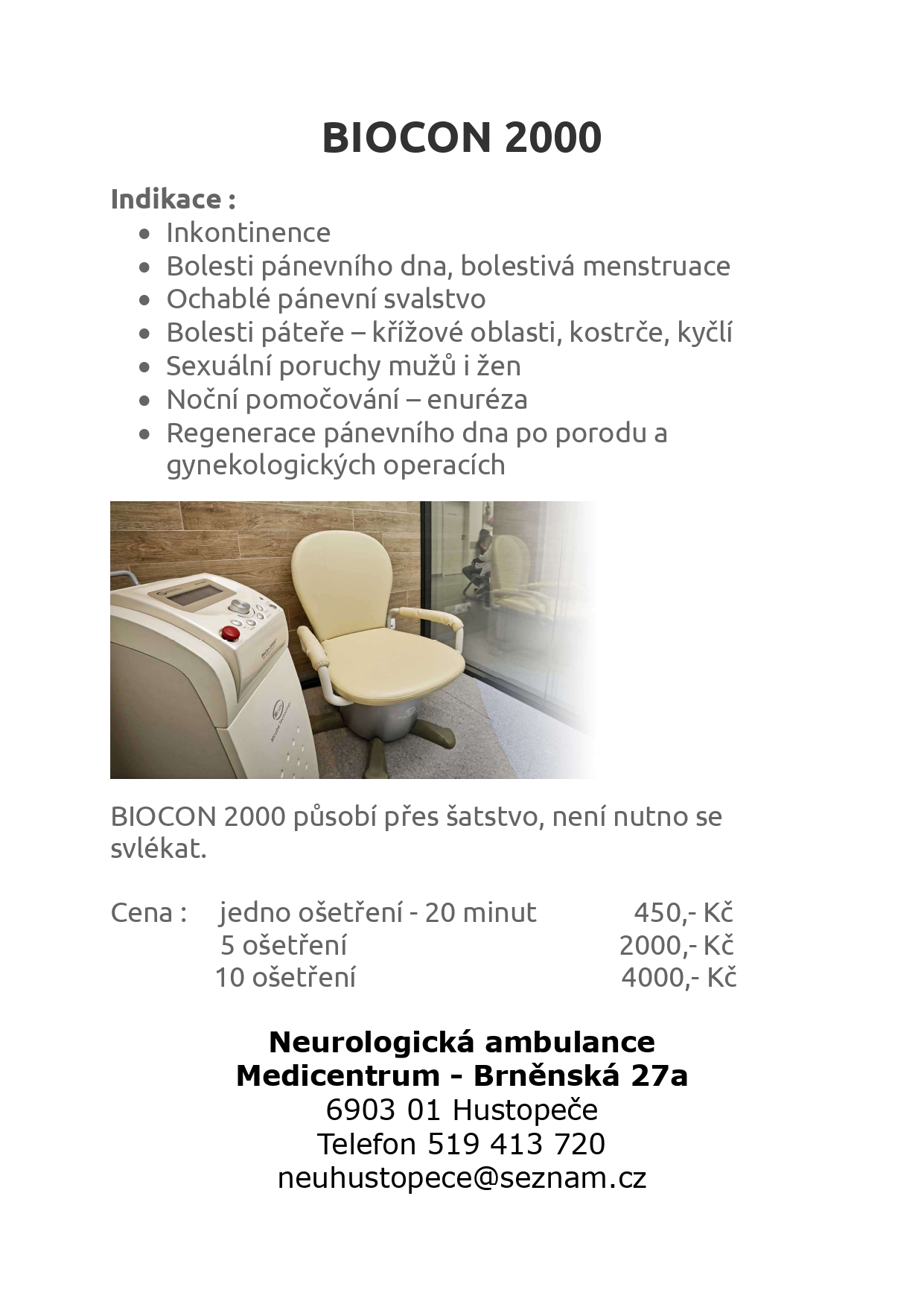 Neurologická ambulance se nachází v prvním poschodí MEDICENTRA Hustopeče, poskytuje ambulantní neurologickou péči pro spádovou oblast Hustopečska v oboru neurologie a realizuje i konziliární službu pro příslušné lůžkové zařízení - Nemocnici Hustopeče.